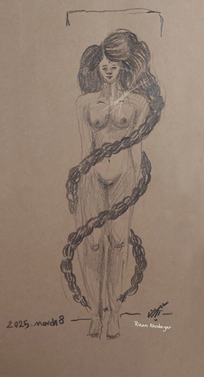 Die menschliche Figur als Terrain der Erkundung. Meine figurativen Zeichnungen sind keine Abbilder, sondern verdichtete Studien von Präsenz, Haltung und innerem Zustand. Linien werden hier zu Grenzen zwischen Sichtbarem und Verborgenem – sie umschreiben die Form, um gleichzeitig das auszulassen, was im Raum zwischen den Strichen mitschwingt.